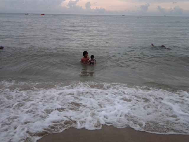 lepak-lepak kat bilik, then guess what? hujan! sakitnye hati!!!!! pukul 6 hujan dah renyai, kitorg keluar jugak, takkan nak terperap kat bilik je kan? sampai kat area pantai Bagan Pinang, kitorg parked kereta & keluar jalan-jalan. happening kat situ, banyak bazaar & kedai-kedai. pegi ke pantai, hujan dah stop. Rizqy nampak je laut, terus menjerit & terus lari ke laut. excited betul dia! so papa pun melayanla mandi laut kejap dgn dia. nasib memang dah pakai board short bagai..